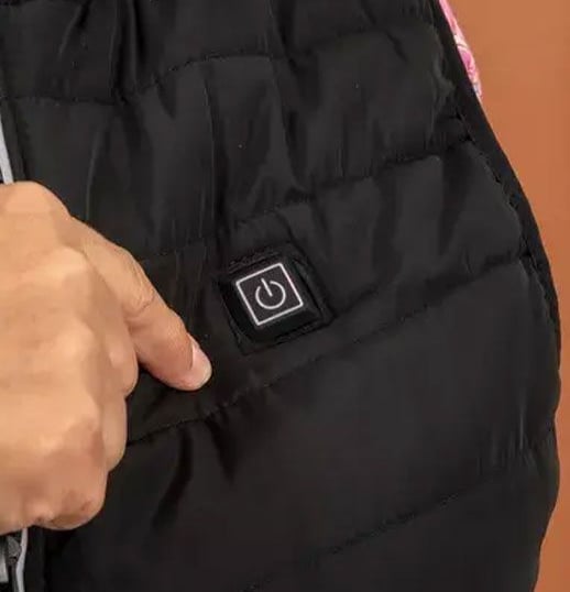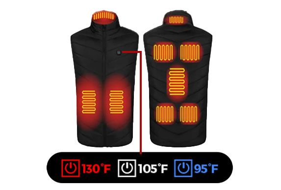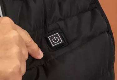 The vest uses flexible carbon-fiber heating elements that warm your chest and back when connected to a USB power bank. You control the temperature using a button on the vest or, in some models, through a mobile app.